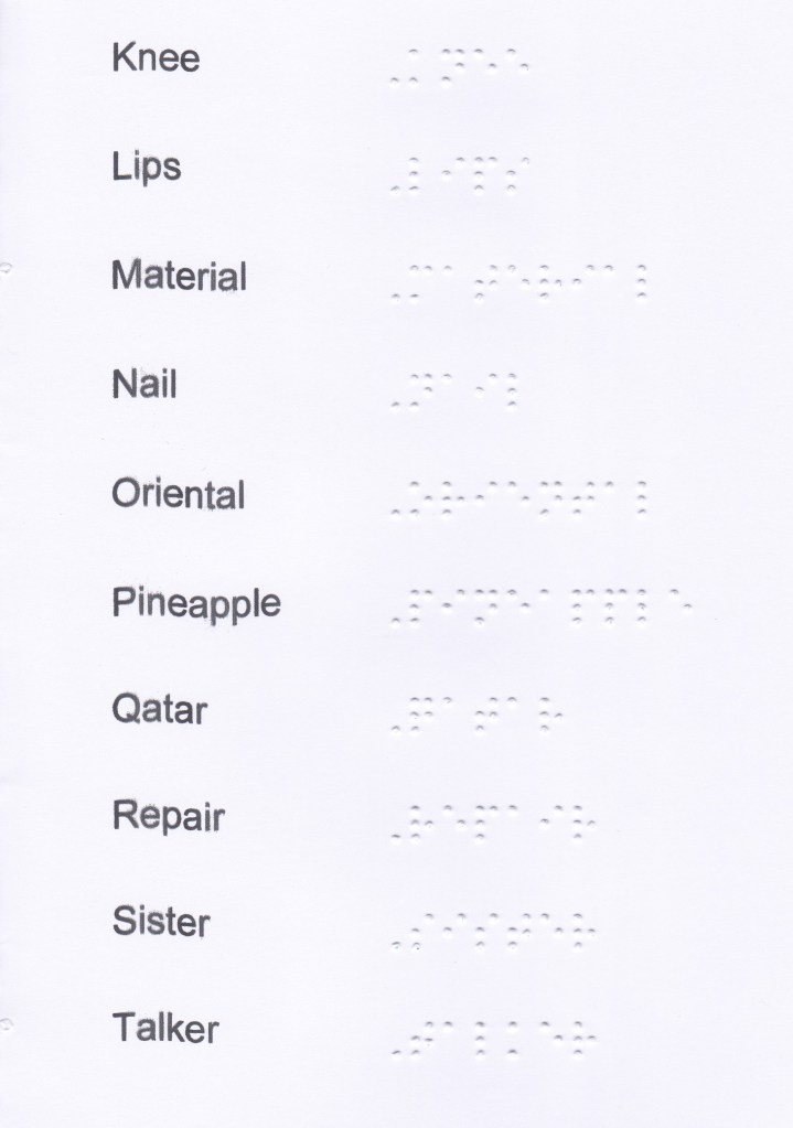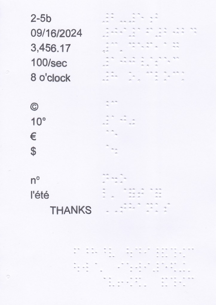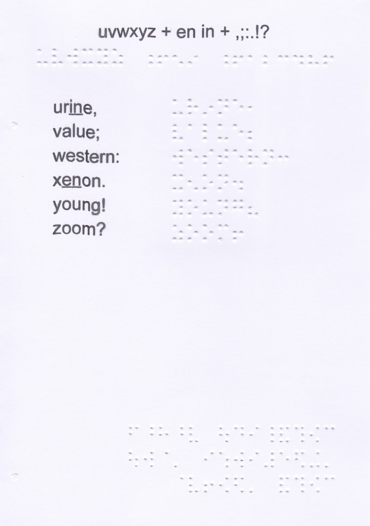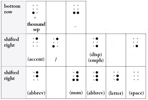 I don’t use all the standard interpretations of english’s braille. I present to you the ones I do use and theirs rules of usage. I put an * when I simplify the use.