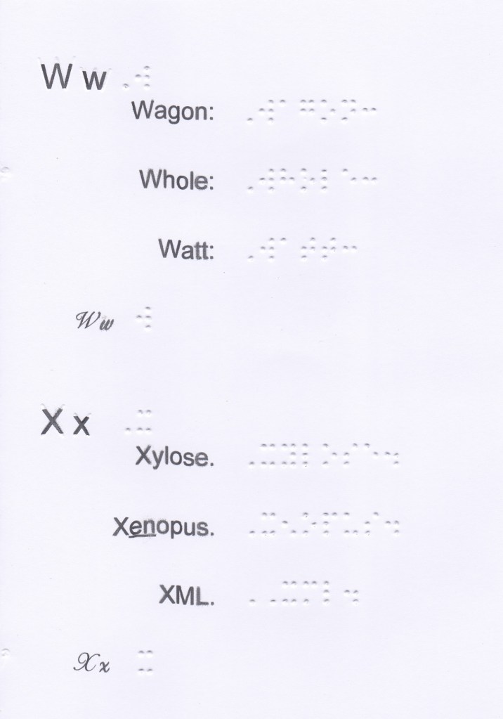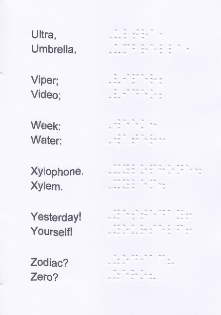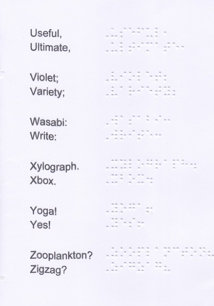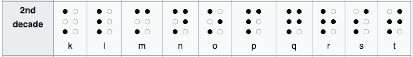 The last letters of the alphabet are divided into 2 decades because at the time of Louis Braille, the letter w being little used, which is why he put it in the 4th series, while the letters from u to z are in the 3rd decade.