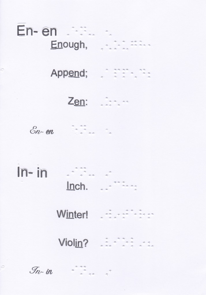 They are used wherever the letters they represent occur. Instead of for en not be used when the letters form a word or an element of a hyphenated compound word. See Booklet « Braille: end of letters ».