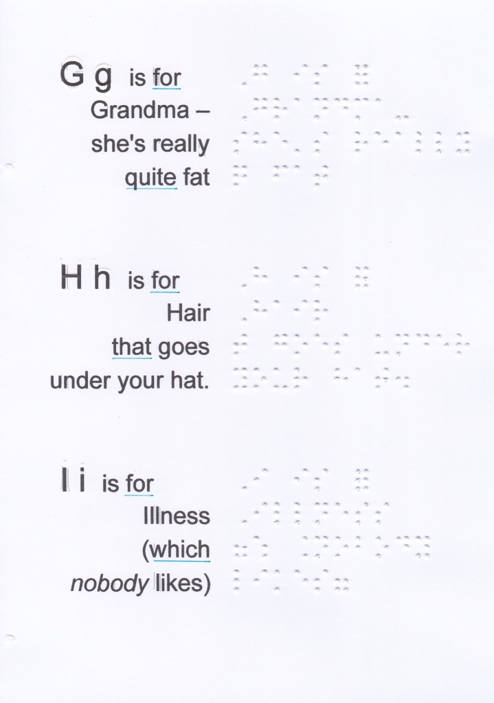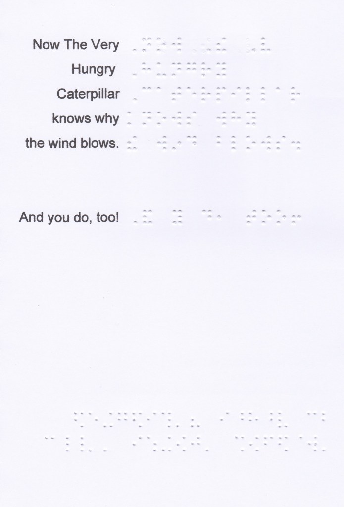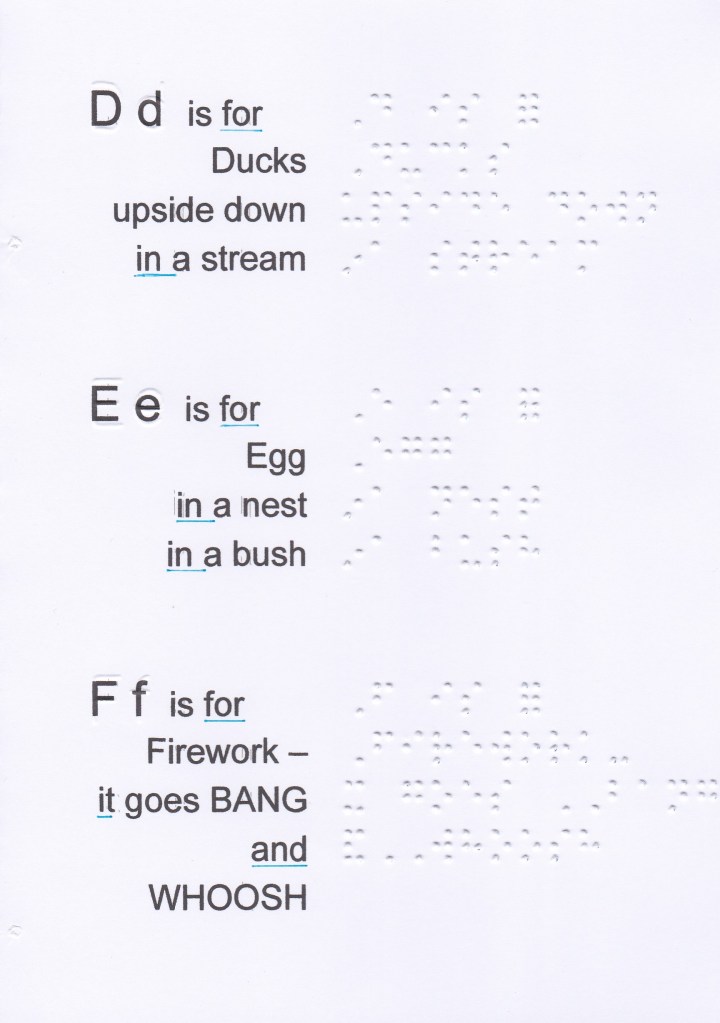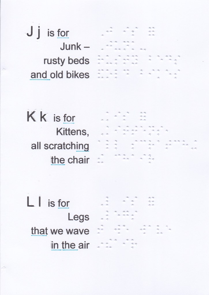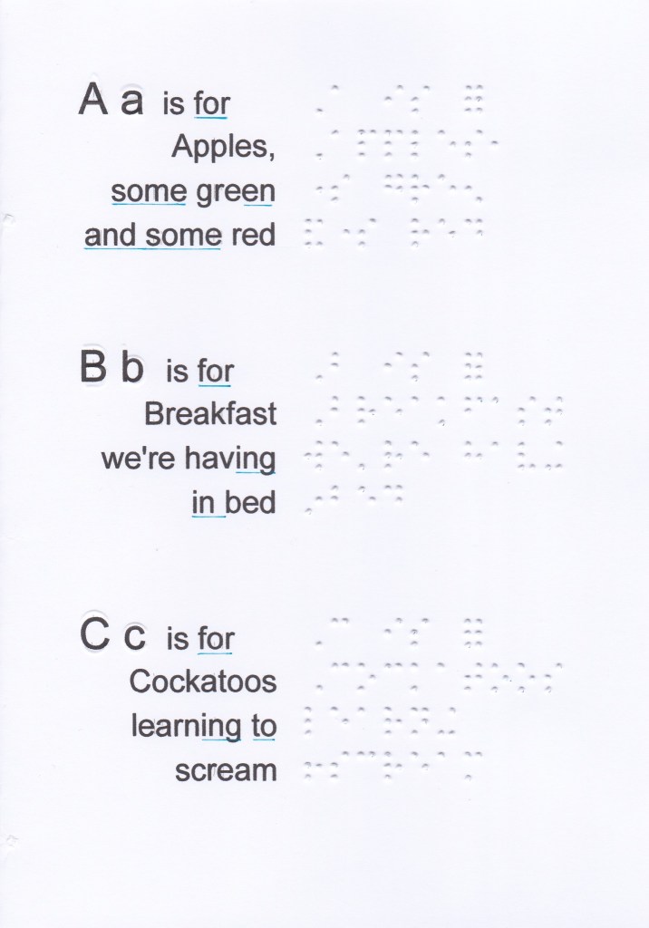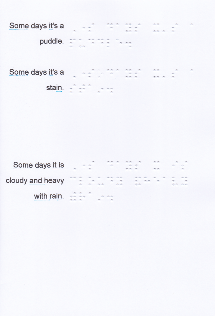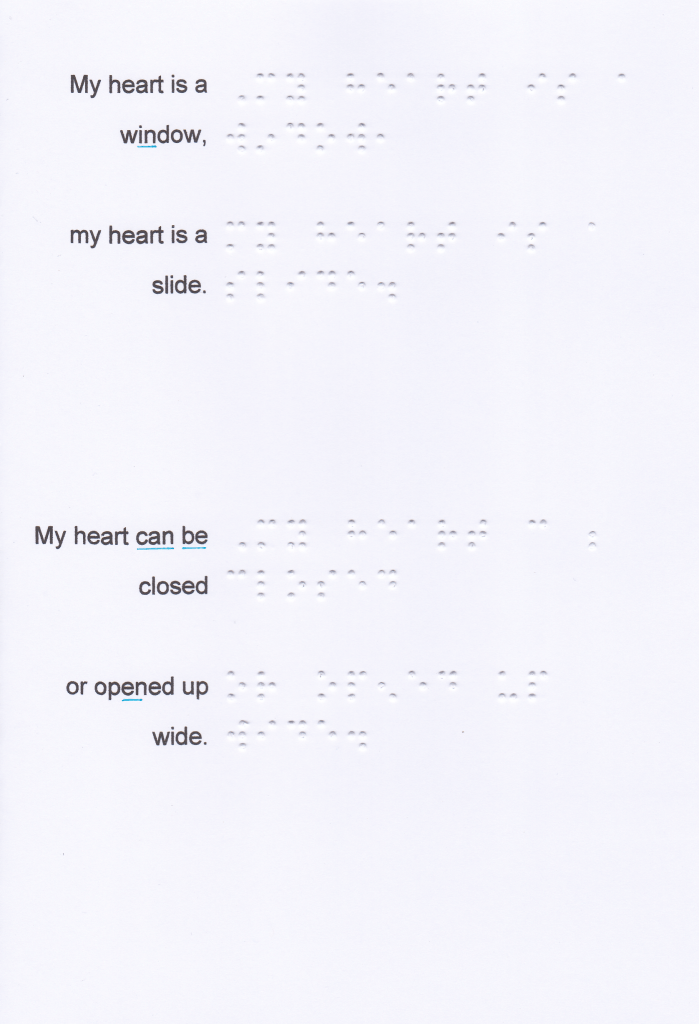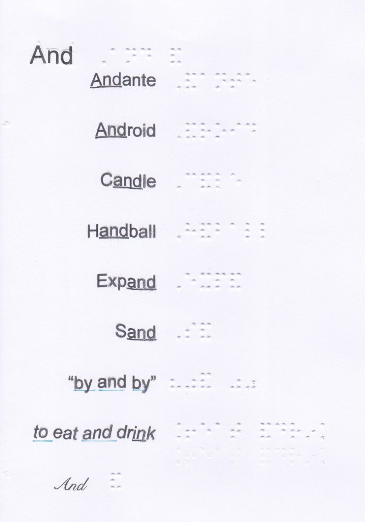 And, for, of, the, with, to, into, by should be written unspaced from a word which follows on the same braille line, even when a sense break or natural pause is present. Instead of
