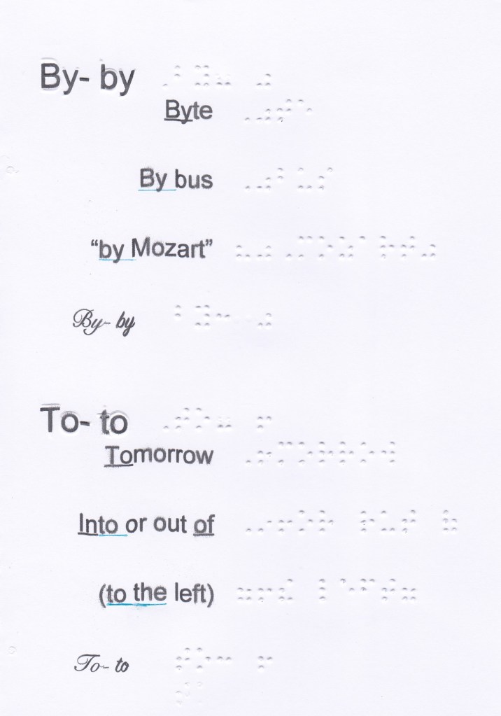 To and by are in the 5th decade. This braille code is also used for punctuation. If ambiguity may arise, it will be necessary to translate letter by letter. We found also the contraction en and in, see in the previous booklet (soon), and some stylistis effect characters present in this booklet.