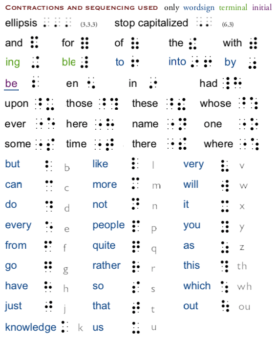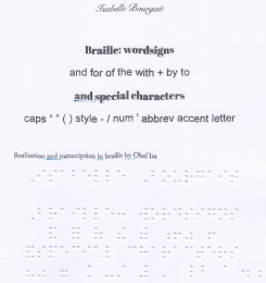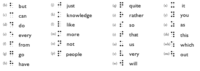 Wordsigns are groups of letters that can be use as a word or as part of words, at the beginning, middle or end. There are many types of contractions and different rules, priority between them, that’s why I will only use the wordsigns presented in this booklet. All other contractions will be translated letter by letter.