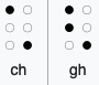 Bottom row corresponds to 5th decade moved down one notch. Only dots 3-6 are used, which is why there are only 2 possible characters.