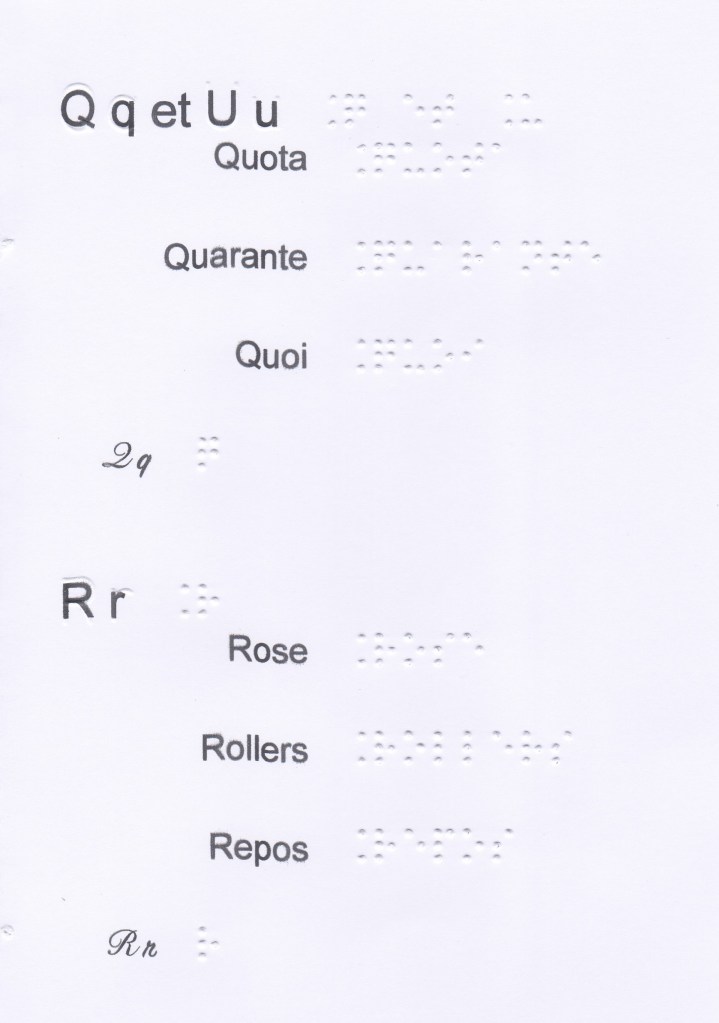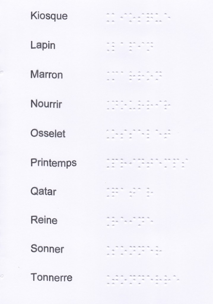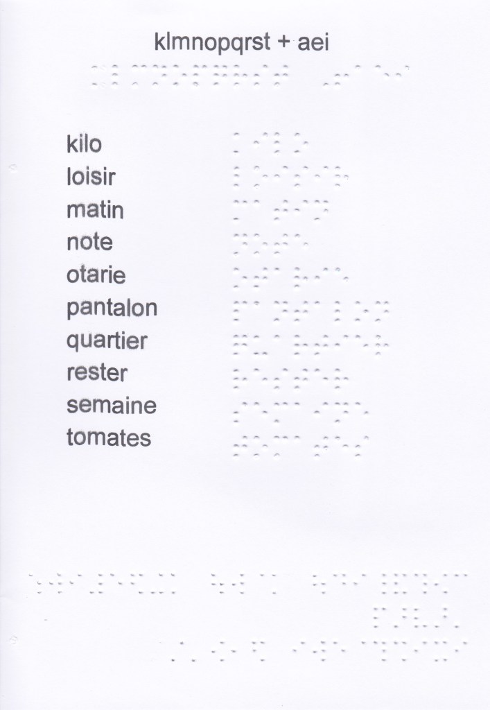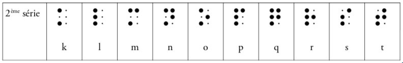 Voici le livret de la seconde série de braille avec les lettres de l’alphabet de k à t, sans accent.