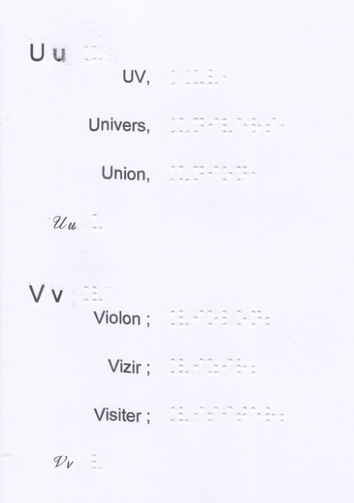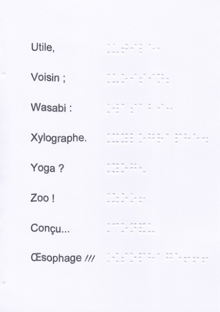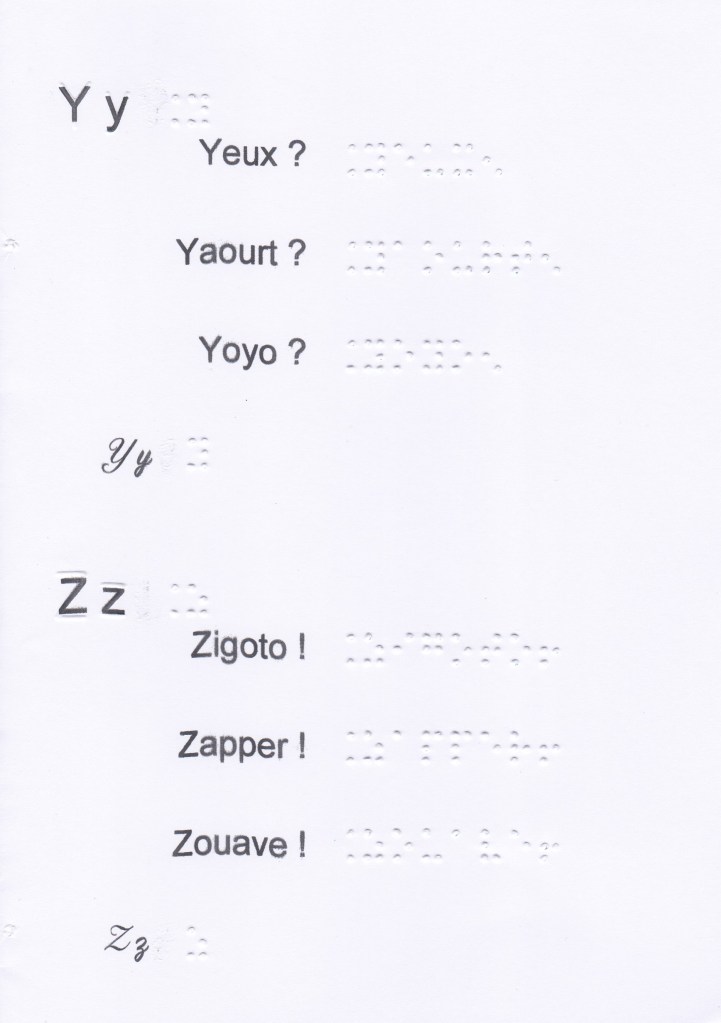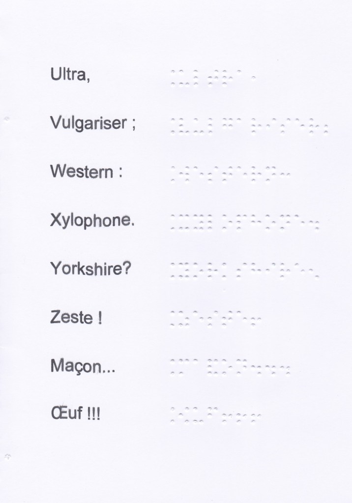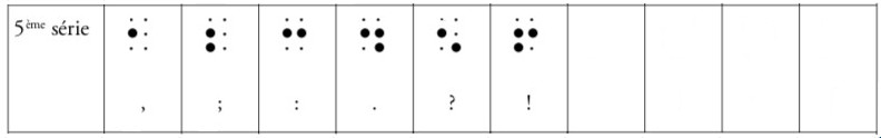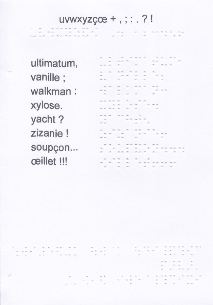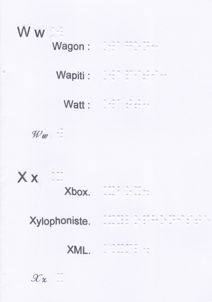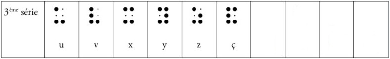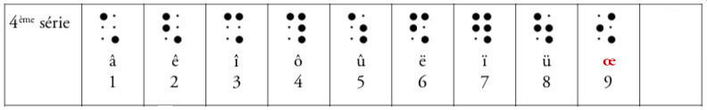 Les dernières lettres de l’alphabet sont réparties dans 2 séries car à l’époque de Louis Braille, la lettre w était peu utilisée, ce qui fait qu’il l’a mise dans la 4ème série avec le œ, alors que les lettres de u à z sont dans la 3ème série.